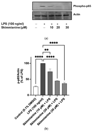 Results from western blotting experiments revealed a significant (p < 0.0001) increase in phospho-p65 protein expression following the stimulation of BV-2 cells with LPS (100 ng/mL) for 60 min when compared with unstimulated cells. In the presence of 10, 20 and 30 μM skimmianine, the levels of phospho-p65 protein were reduced by 26%, 55% and 63%, respectively (Figure 8).