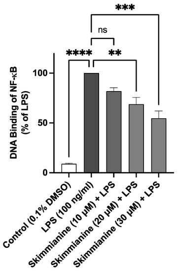Results in Figure 9 show an ~11-fold increase in the binding of NF-κB to consensus binding sites on stimulation of BV-2 microglia with LPS (100 ng/mL) compared with unstimulated cells. In the presence of skimmianine (10 µM), there was an insignificant (p < 0.05) reduction in the binding of NF-κB. However, on increasing the concentrations of skimmianine to 20 and 30 µM, the binding was significantly reduced (p < 0.001) compared with LPS stimulation alone.