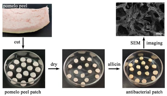 Inspired by the promising prospect that making full use of natural products is an effective way to construct new strategies against wound infection, in this work, a natural antibacterial patch was prepared with a natural active compound as an antibacterial agent and pomelo peel porous structures as the scaffold (Scheme 1) [29]. Through a series of experiments such as scanning electron microscopy, antibacterial experiments, and Live/Dead staining, the antibacterial patches were demonstrated to have good antibacterial properties and biocompatibility, which can even be used for wound infection treatment.