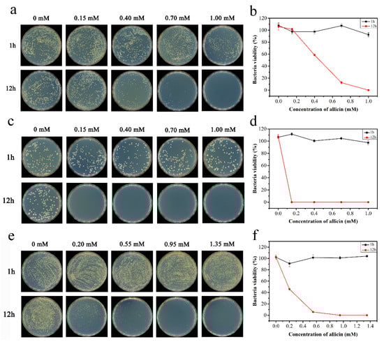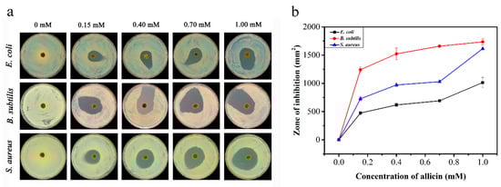 40 μL of bacterial solution from the above bacterial liquid with an OD600nm of 1.5 was placed dropwise into a plate containing a solid medium. Evenly spread the bacteria along the inner wall of the plate with a bacterial coating rod. The pomelo peel with different contents of allicin was slowly placed in the center of the plate covering with bacteria with tweezers. All LB-agar plates were kept under aseptic conditions at 37 °C for 12 h.