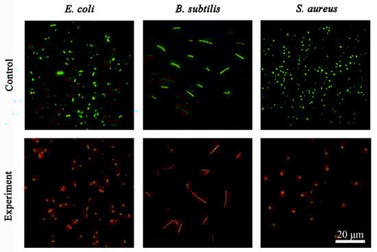 Fluorescence images of the bacteria (E. coli, B. subtilis, S. aureus) stained with SYTO 9 and PI. Scale bar 20 μm.