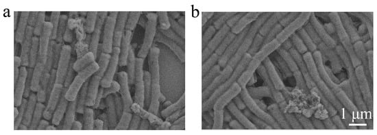 The morphology change of the bacteria after antibacterial patch treatment was further studied by using B. subtilis as a model stain. As shown in Figure 6, both the bacteria before and after being treated showed smooth surfaces and integrated structures. This result indicated that the antibacterial patch cannot cause serious damage to the bacterial structures. Combined with the results of Live/Dead staining, we speculate that the changes of the bacterial membrane permeability and the effect on the internal physiological system of bacteria by allicin may be the main reason for the antibacterial patch.