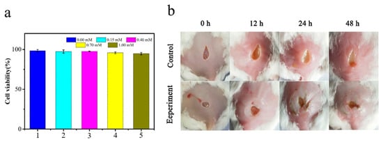 We eventually fabricated a mouse skin wound infection model to test the practical performance of the natural antibacterial patch. As shown in Figure 7b, the mouse skin wounds infected by B. subtilis showed obvious suppuration symptoms. However, in the antibacterial patch treatment group, the wounds’ purulent symptoms were much lighter, and scabbing even occurred two days later, which demonstrated the practical performance of the natural antibacterial patch for wound infection treatment.