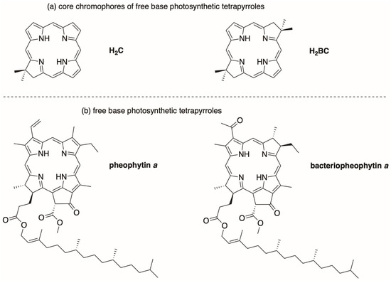 Free base macrocycles. Synthetic chlorin H2C and bacteriochlorin H2BC (a) and native macrocycles (b).