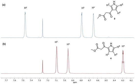 1H-NMR spectral region of two isomers (in CDCl3 at room temperature): (a) the 3-substituted pyrrole (3) and (b) the 2-substituted pyrrole (4).
