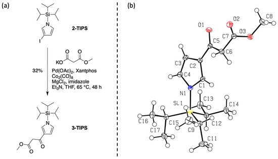 Installation of the β-ketoester (a) and ORTEP diagram of 3-TIPS with thermal ellipsoids drawn at the 50% probability level (b).