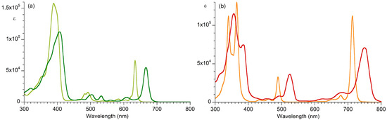 Absorption spectra at room temperature. (a) H2C (in toluene, lime) [30,33] and pheophytin a (in Et2O, green) [32]. (b) H2BC (in toluene, orange) [31] and bacteriopheophytin a (in benzene, red) [32].