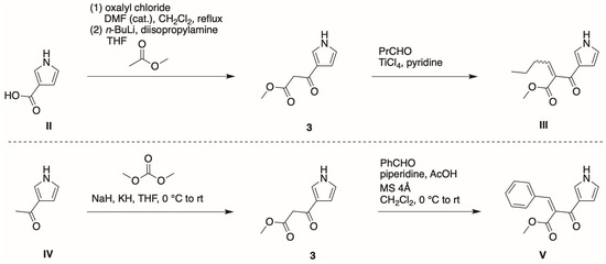 Pyrrole 3 has been employed in studies of Knoevenagel condensation and subsequent Nazarov reaction, but without experimental procedures, characterization data, or information about scale. Two routes have been alluded to for the preparation of 3 (Scheme 2) [15,16].