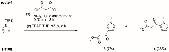 Route 4 arose from a desire for even greater simplicity. Friedel–Crafts acylation [27] of pyrrole 1-TIPS was carried out with methyl malonyl chloride in 1,2-dichloroethane containing AlCl3 (Scheme 4). The conditions are very similar to those of Bray et al. [21], who reported the Friedel–Crafts acylation of pyrrole 1-TIPS with a variety of acylating agents. Subsequent treatment to TBAF in refluxing THF gave the desired pyrrole 3 along with the 2-substituted isomer 4, a known [15,16,28] compound. In one preparation (12 mmol of 1-TIPS), the respective yields were 15% and 14%. In a second preparation (100 mmol of 1-TIPS), the respective yields were 7% (1.10 g) and 36% (6.16 g). The two isomers were readily separable by column chromatography, evidenced by the clean separation on thin layer chromatography (TLC) (Rf = 0.21 and 0.42 with hexanes/ethyl acetate (1:1) on silica). The latter preparation was repeated once, with identical results.