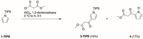 3-(3-Methoxy-1,3-dioxopropyl)-N-triisopropylpyrrole (3-TIPS). Example using pyridine: Following a reported procedure [21] with modification, pyridine (610 µL, 7.6 mmol) was added dropwise to a solution of methyl malonyl chloride (650 µL, 6.1 mmol) in anhydrous 1,2-dichloroethane (22 mL) at 0 °C. After stirring for 15 min, 1-TIPS (1.2 mL, 4.9 mmol) was added dropwise to the reaction mixture at 0 °C. The resulting solution was refluxed for 24 h, then quenched by the addition of saturated aqueous NH4Cl solution (50 mL). The aqueous layer was extracted by CH2Cl2 (3 × 20 mL). The organic extract was washed with saturated aqueous NaHCO3 (2 × 30 mL) and saturated brine (1 × 30 mL), dried (Na2SO4), and concentrated. The crude product was purified by column chromatography (silica, hexanes/ethyl acetate (100:0 then 5:1)) to obtain two unknown products.