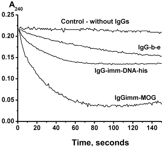 An analysis of the catalase activity of the IgGs was carried out by reducing the absorption of hydrogen peroxide at 240 nm, according to [43]. Figure 1 shows three typical kinetic curves of H2O2 decomposing in the presence of three different IgG preparations. Such kinetic curves were obtained for each individual IgG preparation corresponding to 7 mice from different groups before and after their immunization with MOG or a DNA–histone complex (see below). All IgG preparations degraded the hydrogen peroxide but at different rates.