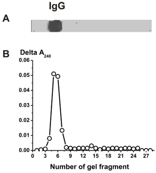 To exclude possible artifacts due to hypothetical traces of contaminating catalases, the IgGs were separated using SDS-PAGE. Their catalase activities were detected using an SDS-PAGE assay as in [40,41,42]. After the use of SDS-PAGE to restore the catalase activity, the SDS was removed via gel incubation for 3 h at 23 °C with K-phosphate (pH 7.0) and washed 14 times with this buffer. The gel strips were cut into small pieces (2.6–3.1 mm), which were carefully crushed and placed in tubes containing 50 μL of K-phosphate (pH 7.0) buffer. For 10 days, the tubes were kept at 4 °C with periodic shaking using a mixer. Then, the gel was removed by centrifugation and the solutions were used to determine the catalase activity. The parallel longitudinal gel strips were used to detect the IgGs’ position on the gel via silver staining. This activity was revealed only in the band of intact IgGs, and there were no other peaks of proteins or catalase activity.