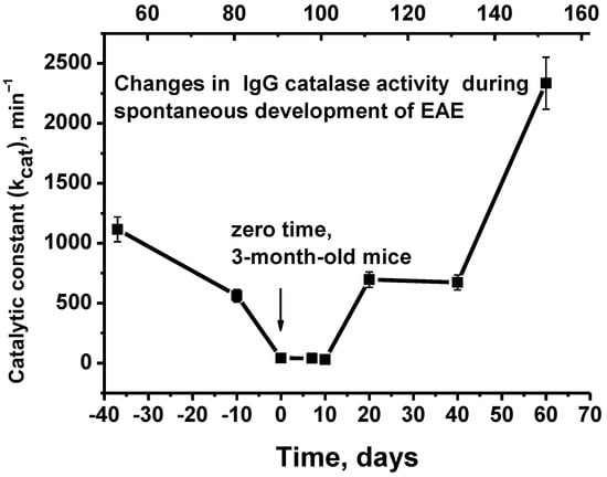 The decrease in catalase activity from 50 days (kcat = 1.1 × 103 min−1) to three months of life (kcat = 40.7 min−1) by a factor of 24.5 (Figure 3) was somewhat unexpected. To analyze this phenomenon, it should be noted that a clear indicator of the development of spontaneous EAE in C57BL/6 mice is the appearance in the blood of Abs that hydrolyze DNA, MOG, and MBP. However, this occurs only in mice at about 3 months of life. Given this, at up to three months of age, C57BL/6 mice may need to be considered conditionally healthy mice. It is possible that the concentration of antibodies with catalase activity in the blood of young mice should be increased and that their maturation can lead to a decrease in their concentration. However, the spontaneous development of EAE leads to a change in the differentiation profile of the bone marrow stem cells, and as a result an increase in the concentration of abzymes with catalase activity may occur.