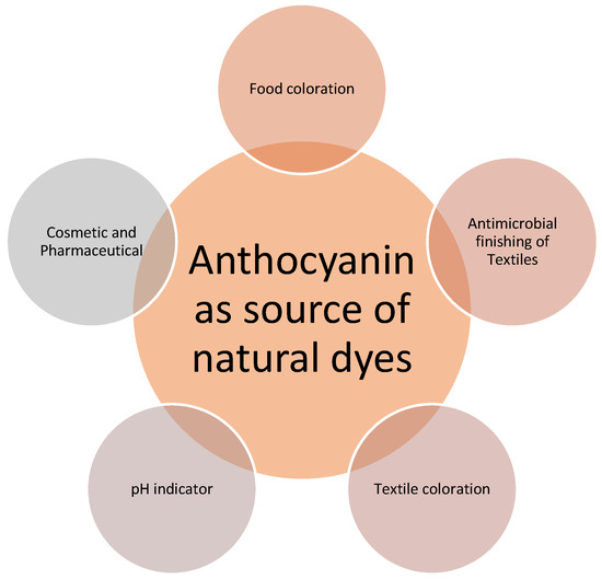 In response to a growing awareness of the detrimental environmental effects of synthetic products, the use of sustainable natural products has become more important [11]. To produce great extraction yields from natural materials, it is vital to choose the most suited extraction techniques and circumstances. Natural colorants have gained popularity due to their properties and health-promoting advantages, as well as their low cytotoxicity in comparison to synthetic colorants [12]. These natural colorants have a wide range of potential uses, notably in the food, textile, and pharmaceutical industries as shown in Figure 1 [13,14,15].