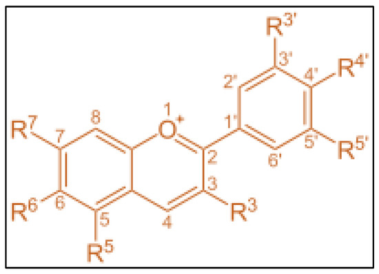 Anthocyanins can be obtained from various plant sources such as tea, wines, nuts, fruits, vegetables, blackcurrant, cocoa, cereals, and honey. Ali, et al. [40] reported that the molecular formula of anthocyanins is C15H11O+, whereas its molecular weight and melting point are 207.24 g/mol and 150 °C, respectively. Despite its high melting point, anthocyanins will degrade at a temperature of 80 °C [41], and it was also revealed that the degradation in anthocyanins was observed when treated at 80 °C. The anthocyanins structure links hydroxyl (−OH) and or methoxyl (−OCH3) groups and one or more sugars as shown in Figure 2 [42].