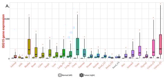 ISG15 in various cancers. (A) expression levels of ISG15 in different cancers. Data from TNMplot, significant differences by Mann-Whitney U test are marked with red [32]. * p < 0.05 vs. normal group. (B) the functional roles of free ISG15 in various cancers.