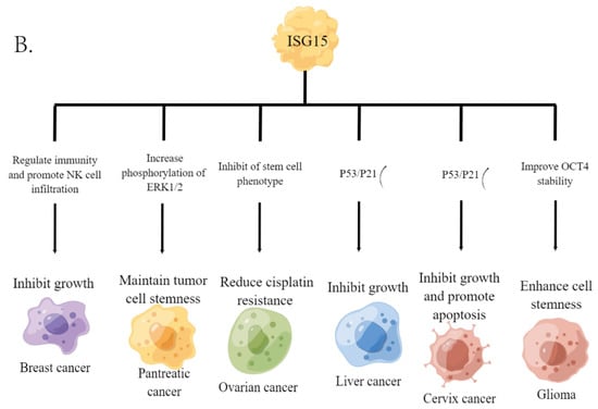 Numerous studies have shown that the production of ISG15 monomer can be stimulated by the activation of the innate immune system [31]. For example, type I interferon can induce cells to express ISG15 in large quantities. Notably, ISG15 displays different levels in different cancers (Figure 2A) [32] and plays a key role in the occurrence and development of tumors. Current studies have shown that ISG15 could promote or inhibit cancer progression in different cancers; for example, free ISG15 can regulate immunity and promote NK cell infiltration, thus promoting breast cancer growth. Furthermore, mammary tumors had higher levels of ISG15 mRNA and protein than normal mammary tissue, and ISG15 may regulate cytoskeleton reorganization [33,34,35]. In pancreatic cancer, free ISG15 may be implicated in maintaining the stemness of tumor cells by increasing the phosphorylation level of ERK1/2 [36]. In ovarian cancer, free ISG15 can inhibit the phenotypes of cancer stem cells (CSCs) to attenuate cisplatin resistance [37]; in liver cancer and cervical cancer, free ISG15 can promote the upregulation of p53/p21 expression, thereby inhibiting tumor progression [38,39]; and in glioma, free ISG15 could improve the stability of OCT4 to enhance the stemness of cells [40] (Figure 2B).