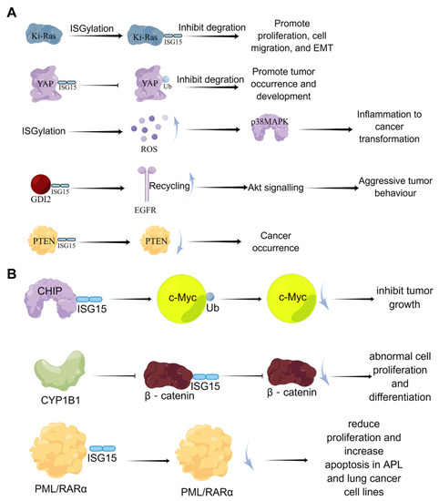 The dual-function of ISGylation in tumor cells. (A) the cancer-promoting effects of ISGylation; (B) the tumor-suppressive effects of ISGylation.