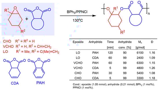 In 2021, Kerton et al. disclosed the BPh3/PPNCl catalyzed copolymerization of organic anhydrides and epoxides [54]. Cyclohexene oxide (CHO), vinyl cyclohexene oxide (VCHO) and also limonene oxide (LO) could be polymerized with phthalic anhydride (PAH) and cis-4-cyclohexene-1,2-dicarboxylic anhydride (CDA), respectively, to give perfectly alternating copolymers with excellent polydispersities (Figure 1).