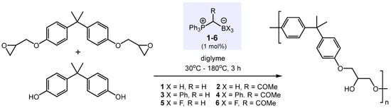 In developing effective “latent catalysts” for the curing of epoxy resins that overcome issues associated with previously utilized systems, such as poor solubility and hygroscopicity, Endo and co-workers studied Lewis pairs of general formula Ph3PCHRBX3, where X = H, Ph, F (Scheme 1) [46,47]. Most of these air- and moisture-stable zwitterionic phosphonium borates 1–6, derived from reactions of the respective boranes with phosphonium ylides, proved to be active pre-catalysts in the co-polymerization of bisphenol A and bisphenol A diglycidyl ether at high temperatures (Scheme 1). The pre-catalyst activity at 120 °C was found to be in the following order: 4 > 2 > 1 > 3 > 5 > 6. The fact that BPh3-adduct 4 and BH3-adduct 2 converted the bisphenol A diglycidyl ether within 3 h to ca. 90% and 70%, respectively, whereas BF3-adduct 6 was essentially inactive, impressively shows the importance of steric and electronic parameters in the design of Lewis pairs as active polymerization catalysts.