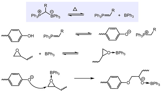 - Kobayashi, M.; Sanda, F.; Endo, T. Substituent Effect of (Triphenylphosphinemethylene)Boranes on Latent Catalytic Activity for Polyaddition of Bisphenol A Diglycidyl Ether with Bisphenol A: Model System of Epoxy−Novolac Resin. Macromolecules 2002, 35, 346–348. [Google Scholar] [CrossRef]