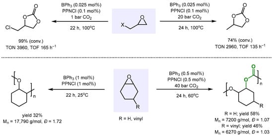 The Kerton group investigated the activity of BPh3 and B(C6F5)3 as catalysts and bis(triphenylphosphine)iminium chloride (PPNCl) as a co-catalyst for the reaction of propylene oxide (PO) and CO2 at 100 °C (Scheme 3) [52]. Both were active catalysts in generating propylene carbonate under identical conditions. These findings were in stark contrast with previous work using triethyl borane as the catalyst, which produced poly(propylene carbonate) [50]. It is worthwhile noting that based on initial rate measurements, the catalyst system BPh3/PPNCl was more than five times faster than B(C6F5)3/PPNCl. This is most likely due to the significantly higher Lewis acidity of B(C6F5)3, which binds much more strongly to the Cl- anion of co-catalyst PPNCl than BPh3 does. Consistent with kinetic studies revealing that lowering the CO2 pressure increases the reaction rate, BPh3 catalyzed the reaction of epichlorohydrin with CO2, even under atmospheric CO2 pressure, to give the respective cyclic carbonate as the sole product.