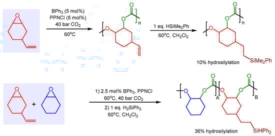 In a follow-up study, Kerton and co-workers investigated the ability of BPh3 to catalyze the addition of Si–H groups onto a vinyl-substituted polycarbonate [53]. In a ‘one-pot’ sequence, BPh3 catalyzed both reactions: the copolymerization of VCHO and CO2 to polycarbonate followed by the hydrosilylation of the vinyl groups in the polymer with phenyl dimethyl silane to give side-chain silylated polycarbonate (Scheme 4). Perhaps for steric reasons, the degree of hydrosilylation of polycarbonate was only 10%. However, when using a polycarbonate terpolymer derived from CHO, VCHO, and CO2, the degree of hydrosilylation could be increased to 36%, in this case with H2SiPh2 as the hydrosilylation reagent.