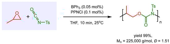 Gnanou, Feng, and co-workers investigated triethyl borane (BEt3) catalyzed copolymerizations of epoxides with organic isocyanates to polyurethanes [55], challenging transformations due to the propensity of most isocyanates to undergo side-reactions such as homopolymerization, cyclotrimerization and [2 + 3] cycloaddition with epoxides. Strongly electron-withdrawing p-tosyl isocyanate (TSI) was found to be the most suitable substrate selectively undergoing copolymerization with a range of epoxides to form almost perfectly alternating polyurethanes (less than 1% ether linkages in the polymer) in high yields and purities. Interestingly, when investigating the impact of the Lewis acidity of the borane catalyst on the rate of propylene oxide/TSI copolymerization, it was found that with BPh3, a stronger Lewis acid than BEt3, the reaction occurred explosively with the release of large amounts of heat. Astonishingly, with very low catalyst loadings of 0.05 mol% BPh3 and 0.1 mol% PPNCl, complete polymerization was accomplished within 10 min with turnover frequencies of over 10,000 h−1, and a remarkably high number of averaged molecular weight (Mn = 225,000 g/mol), exclusively alternating polyurethane structure and a polydispersity of 1.51. Unfortunately, a substrate scope with this highly active and selective catalyst system was not investigated (Scheme 6).