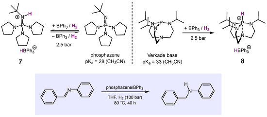 Building on these and other results [62,63], Krempner et al. employed the bulky organosuperbases Verkade base (pKa = ~33 in CH3CN) and phosphazene (pKa ~28 in CH3CN) in combination with BPh3 (Scheme 7) [64]. Upon exposure to H2, both FLPs instantly generated the corresponding borate salts 7 and 8 in yields of 71% and 85%, resp. Solutions of 8 appeared to be thermally stable, while 7 in solution quickly released H2 when heated to 60 °C, indicating reversibility of heterolytic hydrogen cleavage, which is key to the development of effective hydrogenation catalysts. In fact, BPh3/phosphazene was demonstrated to be an active FLP catalyst system in the quantitative hydrogenation of the N-benzylidene aniline to N-benzyl aniline in THF as solvent.