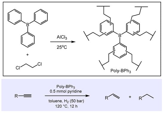 An interesting extension of this concept was recently introduced by Hu and co-workers for the FLP-catalyzed hydrogenation of alkynes [65]. Because the molecular FLP BPh3/pyridine thermally degraded during hydrogenation of phenylacetylene (conversion 12% after 12 h at 120 °C and 50 bar H2), the group developed a polymeric Lewis acid based on BPh3. The synthesis is illustrated in Scheme 8 and involves a classical Friedel–Crafts reaction of BPh3 with 1,2-dichloroethane in the presence of AlCl3.