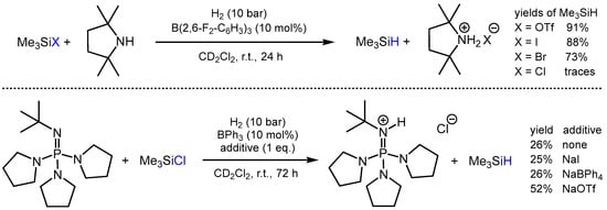 Recent developments concerning iridium- and ruthenium-catalyzed hydrogenations of organosilicon compounds [66,67,68,69,70] motivated the Cantat group to design FLP catalysts for the metal-free hydrogenation of various organosilanes with Si-X bonds (X = OTf, I, Br, Cl) [71]. After extensive screening, B(2,6-F2-C6H3)3 as the Lewis acid combined with stochiometric amounts of 2,2,6,6-tetramethylpiperidine (TMP) as the base was identified as the most effective FLP catalyst for the hydrogenation of Me3SiX (X = OTf, I, Br) to Me3SiH (Scheme 9). Employing the same FLP catalyst, Et3SiOTf, Ph3SiOTf, and (Pri)2Si(OTf)2 could be hydrogenated to the corresponding hydrosilanes in good yields as well. However, irrespective of the base used, B(2,6-F2-C6H3)3 was not able to convert the more challenging substrate Me3SiCl to Me3SiH, primarily because of the comparably stronger Si-Cl bond and lower hydricity of the respective borohydride anion, HB(2,6-F2-C6H3)3–, formed upon H2-splitting. Building on the idea of favoring the thermodynamics by increasing the hydricity of the borohydride, less Lewis acidic BPh3 was tested in combination with stronger base phosphazene to ensure H2-cleavage. With this FLP in hand, 28% of Me3SiCl were converted after 72 h to Me3SiH in yields of 26%. Moreover, upon adding the chloride abstracting additive NaOTf, the yields of Me3SiH were further increased to a respectable 52% (Scheme 9).