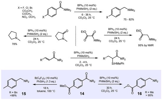 Aromatic and aliphatic tertiary amines were obtained in good to excellent isolated yields. In contrast, α,β-unsaturated amides underwent hydrosilylation of the olefinic groups (C=C) to give the respective α-silylated amides. In addition, this process showed a good functional group tolerance with additives such as acetophenone, ethyl acetate, N-benzylidene aniline, tert-butyl isocyanate, and thiophene not inhibiting the activity of the catalyst. Only in the case of benzaldehyde and ethanol, hydrosilylation and dehydrosilylation, respectively, occurred prior to amide reduction. The addition of pyridine deactivated the catalyst due to irreversible Lewis acid–base adduct formation with BPh3. The BPh3-catalyzed amide hydrosilylations described by Okuda’s group appear to be superior in terms of both functional group tolerance and chemo-selectivity when compared with other metal-free catalysts reported in the literature [74,75]. For example, B(C6F5)3 catalyzes the reduction of both functional groups of 14, the ester as well as the amide, to give benzylamine 15. In contrast, BPh3 reduces the amide group while keeping the ester group intact leading to the selective formation of the ester-functionalized benzylamine 16 (Scheme 11) [74].