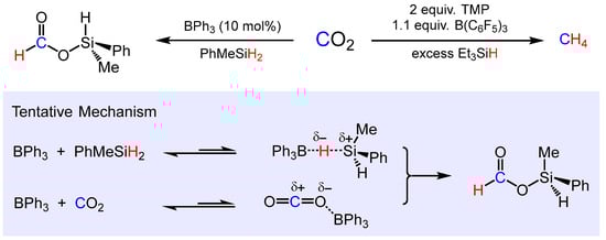 The same group reported the BPh3-catalyzed hydrosilylation of CO2 (Scheme 12) [77]. This approach enabled the highly selective formation of silyl formates with various hydro silanes such as PhSiH3, PhMeSiH2 or Et3SiH in polar solvents such as acetonitrile, nitromethane and propylene carbonate. No turnover was observed in less polar and non-polar solvents such as benzene, toluene, tetrahydrofuran (THF) and CH2Cl2. Mechanistically the BPh3-catalyzed hydrosilylation of CO2 is suggested to proceed via the dual activation of CO2 and organosilane by BPh3, where polar solvents with high dielectric constants stabilize the partially charged transient species (Scheme 11). Note that strongly Lewis acidic B(C6F5)3 itself was not capable of catalyzing the hydrosilylation of CO2, while as the FLP component in combination with tetramethyl piperidine (TMP) as a Lewis base and with an excess of triethylsilane CO2 was quantitatively reduced to give CH4 [78].