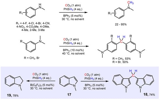More recently, Ema and co-workers reported the utilization of CO2 as C1-feedstock for the reductive methylation of secondary and tertiary aromatic amines derivatives, employing PhSiH3 as a reducing agent and BPh3 as the catalyst (Scheme 13) [79,80]. The N-methylation of sec-amines was achieved with 1 atm of CO2, 4.0 equivalents of PhSiH3 and 5 mol% of BPh3 under solvent-free conditions at 30 °C. The process tolerates various functional groups such as halides, nitrile, nitro, ester and alkoxy groups. On the other hand, C-methylenation was observed with tertiary aromatic amines to give the corresponding diarylmethanes in moderate yields at 40 °C. Note that B(C6F5)3 was inactive even at higher temperatures in any of these transformations, probably due to irreversible Lewis acid–base adduct formation. Similar to what was seen for the reaction of tertiary aromatic amines, 1-methylindole at 30°C converted to 3,3′-methylenebis(1-methylindole) 18 in good yields. On the contrary, B(C6F5)3 catalyzed the formal hydrogenation of the olefinic bond of N-methyl indole to selectively give N-methyl dihydroindole 19.