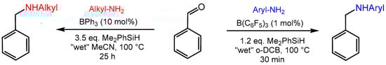 Motivated by the moderate water tolerance of B(C6F5)3 in catalytic hydrogenation reactions [81], Ingleson and co-workers disclosed the triaryl borane catalyzed reductive aminations of aldehydes to aromatic and aliphatic amines using Me2PhSiH as the reducing agent [82,83]. Notably, the employed catalysts BPh3 and B(C6F5)3 showed strikingly different selectivities for aliphatic and aromatic amine substrates (Scheme 14). With B(C6F5)3 as the catalyst, the amine substrates were limited to aryl amines (pKa of the conjugate acid < 12), while with weaker Lewis acidic BPh3, the more basic alkyl amines (pKa of the conjugate acid > 16) performed well with excellent conversions and yields. These findings were attributed to the different interactions of the amine base with the intermediately formed water adducts H2O→BPh3, and H2O→B(C6F5)3. Thus, with more basic alkyl amines, irreversible deprotonation of the highly acidic adduct H2O→B(C6F5)3 (pKa = 8.4 in CH3CN) occurred, resulting in the degradation of the catalyst. BPh3, on the other hand, undergoes rapid protodeboronation in the presence of the more acidic aryl amines. It is worth noting that the in situ generated Lewis acid B(3,5-Cl2-C6H3)3, whose Lewis acidity is in between B(C6F5)3 and BPh3, was capable of catalyzing the reductive amination with both aryl and alkyl amines. However, a detailed substrate scope was not explored with B(3,5-Cl2-C6H3)3 as the catalyst.