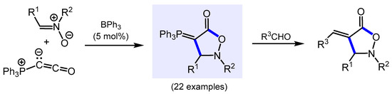 Krempner and co-worker reported the Lewis acid catalyzed [2 + 3] cycloaddition of Bestmann’s ylide, Ph3P=C=C=O, with nitrones to produce a variety of previously unknown 5-isoxazolidinones with exocyclic phosphonium ylide functionality in excellent isolated yields [84]. Subsequent quenching with reactive aldehydes via a classical Wittig reaction gave access to 5-isoxazolidinones with exocyclic double bonds (Scheme 15).