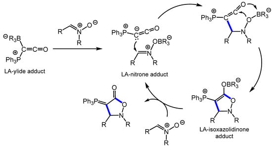 Proposed mechanism of the BPh3-catalyzed formal [2 + 3] cycloaddition of Ph3PCCO with nitrones (LA = Lewis acid).