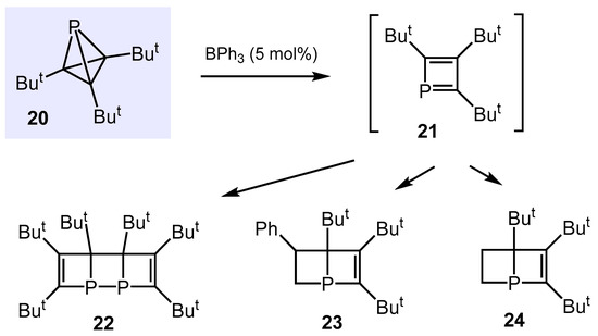 Recently, Cummins and co-workers disclosed the synthesis and reaction behavior of highly strained tri-tert-butylphosphatetrahedrane 20 (Scheme 17) [86]. Thus, upon the addition of BPh3 (20 mol%), 20 underwent rapid dimerization to form the bicyclic structure 22 in 72% yield. To trap potential intermediates, tetrahedrane 20 was treated with a 20-fold excess of styrene, which in the presence of BPh3 (20 mol%) furnished the cycloaddition product 23 in a yield of 88%. Similarly, BPh3 catalyzed the cycloaddition of 20 with 1 atm of ethylene to give the corresponding bicyclic structure 24 in yields of 74%. Quantum chemical calculations revealed BPh3 to mediate C−P bond cleavage to give intermediately tri-tert-butyl-phospacyclobutadiene 21, which subsequently either dimerizes to 22 or undergoes a formal [2 + 4] cycloaddition with styrene and ethylene to yield 23 and 24, respectively.