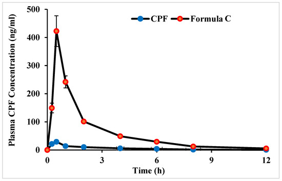 | Pharmacokinetic Parameters | CPF Solution | Formula C |