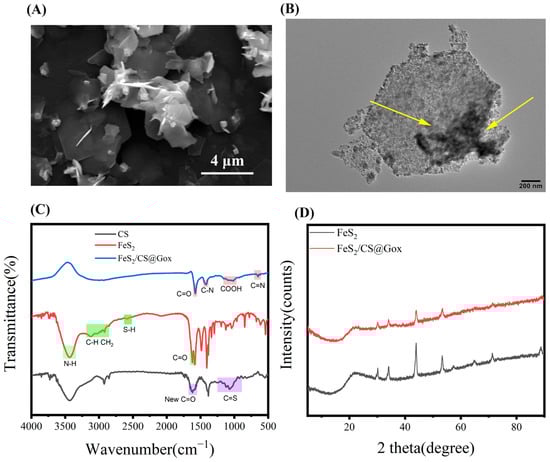 (A) The SEM picture of FeS2/CS@Gox. (B) The TEM picture of FeS2/CS@Gox (The yellow arrow points to the attachment on FeS2). (C) The FTIR of CS, FeS2 and FeS2/CS@Gox. (D) The XRD pattern of FeS2 and FeS2/CS@Gox.