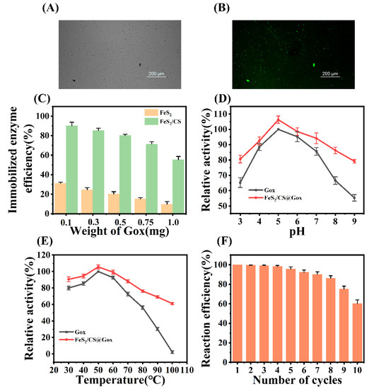 The conjugation of Gox to the FeS2 nanosheets was confirmed by green fluorescent labeling. As shown in Figure S4, there was a clearly visible green fluorescence under ultraviolet light which confirmed the presence of Gox in the FeS2/CS particles. Furthermore, fluorescence microscopy of the FeS2/CS@Gox particles showed that FeS2 exhibited an aggregated morphology in the field of view, and bright green fluorescence coincided with the distribution of FeS2 (Figure 2A,B). Subsequently, we investigated the effect of adding different amounts of Gox to the enzyme immobilization ratio. The enzyme immobilization did not exceed 30% when only FeS2 and Gox were linked covalently, but the FeS2/CS had higher immobilization efficiency. FeS2/CS had the highest efficiency and loading capacity when Gox was added at 0.5 mg, which was the most suitable concentration for enzyme immobilization in this system (Table S1 and Figure 2C). In an aqueous solution, Gox readily self-dissociates when it is directly chemically bound to FeS2, but CS creates a confined space for FeS2@Gox, making Gox dissociation challenging. The effects of pH and temperature on immobilized enzymes were then further investigated. As shown in Figure 2D,E, the immobilized enzyme exhibited higher catalytic activity than the free enzyme, which may be due to the attachment to the support changing the functional groups of the enzyme. In addition, it has been reported that the sulfide helps to enhance the activity of the enzyme, and the catalytic activity of Gox can be significantly improved by the numerous thiol groups in FeS2 [40]. Additionally, the immobilized enzymes demonstrated improved catalytic activity in extreme circumstances. The immobilized enzyme may retain more than 80% of its catalytic activity in acidic and alkaline environments, whereas the catalytic activity of the free enzyme is less than 60%. The catalytic activity of enzymes is also impacted by temperature. Free enzymes barely exhibit any catalytic activity at 100 °C, but immobilized enzymes exhibit more than 60% catalytic activity. The results demonstrated that the stability and catalytic activity of the enzyme were significantly improved by immobilizing it with FeS2 and CS. Reusability is a crucial aspect of immobilized enzymes, and Figure 2F shows the reuse of the FeS2/CS@Gox. The catalytic efficiency of FeS2/CS@Gox remained above 80% over the first eight reuse cycles, but further usage eventually resulted in structural degradation and a loss of mass transfer, which would lower catalytic performance [41]. The use of enzyme engineering in actual manufacturing will be encouraged by its excellent reusability, which will lower costs and boost yield.