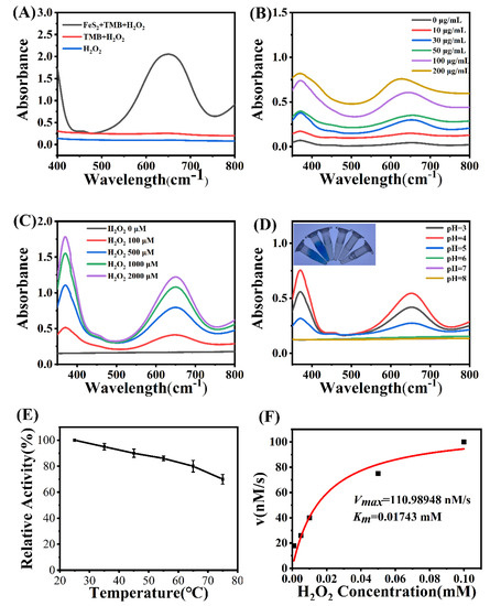 (A) UV−vis absorbance spectra changes of TMB in different reaction systems. (B) UV−vis absorbance spectra changes of TMB in different concentrations of FeS2. (C,D) UV−vis absorbance spectra changes of TMB in different concentrations of H2O2. (E) The effect of temperature on the catalytic activity of POD-like FeS2. (F) Kinetic assay for the POD-like activity of FeS2 nanozymes with H2O2 as substrate.