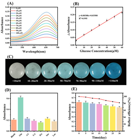 (A) UV–vis absorption spectra of FeS2/CS@Gox in different glucose concentrations. (B) Linear calibration curve of the absorbance at 652 nm against glucose concentration. (C) Standard color chart of glucose concentration and color change of FeS2/CS@Gox. (D) Selectivity toward glucose of the above system against potential interfering substances. (E) Shelf life of the glucose detection system.