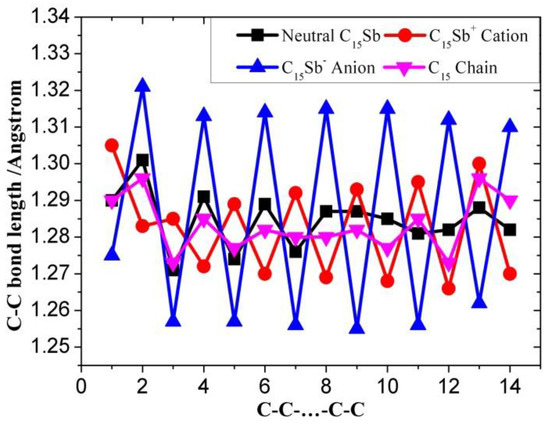 C-C bond length alteration of neutral C15Sb, C15Sb+ cation, C15Sb− anion, and pure carbon chain C15 as a function of number of carbon atoms.