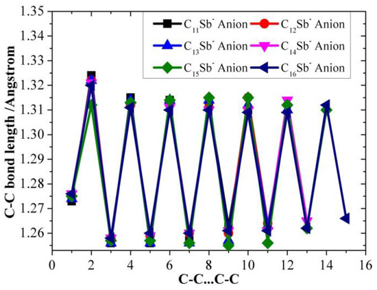 C-C bond length alteration of neutral C16Sb,C16Sb+ cation, C16Sb− anion, and pure carbon chain C16 as a function of number of carbon atoms.