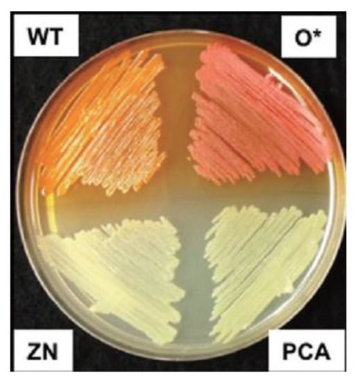 On agar plate, strains: P. chlororaphis 30-84 wildtype (WT), phenazine non-producer (ZN), PCA only producer (PCA), and 2-OH-PCA overproducer (O*) [18].