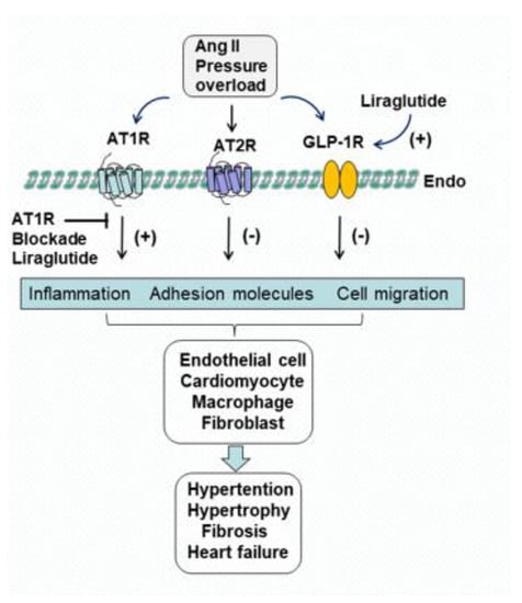 Ang II AT1R and AT2R are a class of G protein-coupled receptors expressed in the heart, blood vessels, kidney, adrenal cortex, lungs and brain. Activation of AT1R induces inflammation, endothelial dysfunction, vasoconstriction, vascular media hypertrophy, left ventricular hypertrophy and myocardial fibrosis. On the other hand, AT2R has consistently been shown to play a protective role in the attenuation of vascular smooth muscle cell proliferation, cardiovascular hypertrophy, fibrosis and cardiac dysfunction [8]. We reported that Ang II infusion or pressure overload upregulates the AT1R protein, and enhances its localization in the intracardiac vessels and myocardium, and is accompanied by a downregulation of AT2R protein and expression. These actions of Ang II were significantly blocked by liraglutide [19]. Blockade of AT1R was also associated with an inhibition of macrophage migration, fibroblast proliferation, left ventricular dysfunction and myocardial fibrosis. Consistent with data showing antagonism of AT1R, the level of AT2R protein was augmented, and its expression in the intracardiac vessels and myocardium was enhanced by liraglutide. A comparison of the beneficial effects between liraglutide and telmisartan, an AT1R blocker, on Ang II-induced changes in the expression of AT1R and AT2R [20] suggests that cardiovascular protection with liraglutide is associated with its dual actions on AT1R and AT2R (Figure 2).
