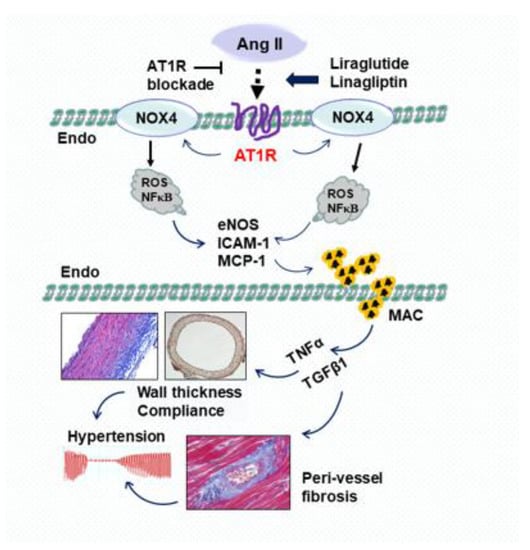 The signaling pathways proposed in vascular protection by preserving GLP-1 using the GLP-1R agonist liraglutide and DPP-4 inhibitor linagliptin as well as the AT1R blockade. Ang II activates NOX4/NADPH oxidase expressed on the endothelium by stimulating AT1 receptor. The increased production of reactive oxygen species (ROS) and NFκB by NOX4 causes eNOS uncoupling, enhances the expression of intercellular adhesion molecule-1 (ICAM-1) and monocyte chemoattractant protein-1 (MCP-1), and facilitates the migration/infiltration of monocytes/macrophages (MAC). TNFα and TGFβ1 released from macrophages increase vascular wall thickness, decrease vascular compliance and induce perivascular fibrosis, resulting in endothelial dysfunction and hypertension. Upregulating GLP-1 levels with liraglutide/linagliptin or blocking AT1R inhibits the cascades of the Ang II/NOX4/ROS signaling pathways, and protects vascular function via inhibiting Ang II-induced vascular remodeling. Endo: endothelium.