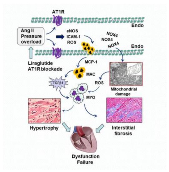 Potential signaling pathways involved in cardioprotection by GLP-1 receptor (GLP-1R) agonist and AT1 receptor (AT1R) blockers on Ang II and pressure overload-induced cardiomyocyte hypertrophy, tissue fibrosis and cardiac dysfunction. Ang II or pressure overload induces eNOS uncoupling and enhances the expression of intercellular adhesion molecule-1 (ICAM-1) through activation of AT1R. Furthermore, the production of reactive oxygen species (ROS) from activated endothelium and mitochondria facilitates the migration of macrophages (MACs) via overexpressed monocyte chemoattractant protein-1 (MCP-1). TGFβ1 released from interstitial macrophages promotes the proliferation of myofibroblasts (MYO), leading to myocardial morphological change and heart failure. Blockade of AT1R with liraglutide or telmisartan reduces the expression of AT1R, inhibits the cascade of the AT1R/NOX4/ROS signaling pathways, and thereby protects the heart against Ang II-induced myocardial remodeling.