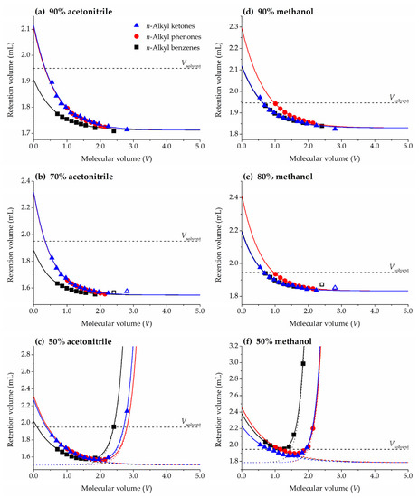 Representative plots of pure HILIC ((a) 90% acetonitrile, (d) 90% methanol), HILIC and slightly RPLC ((b) 70% acetonitrile, (e) 80% methanol), and mixed HILIC-RPLC ((c) 50% acetonitrile, (f) 50% methanol) behavior in the ZIC-HILIC column. For (a,b,d,e) solid lines represent fittings to Equation (6) (empty symbols in (b,e) represent homologues not included in the fittings). For (c,f) solid lines represent fittings to Supplementary Materials: Equation (S1), dashed and dotted lines show the contributions to the mixed mode of HILIC and RPLC, respectively. The dashed straight line shows the solvent volume inside the column pycnometrically measured (Vsolvent).
